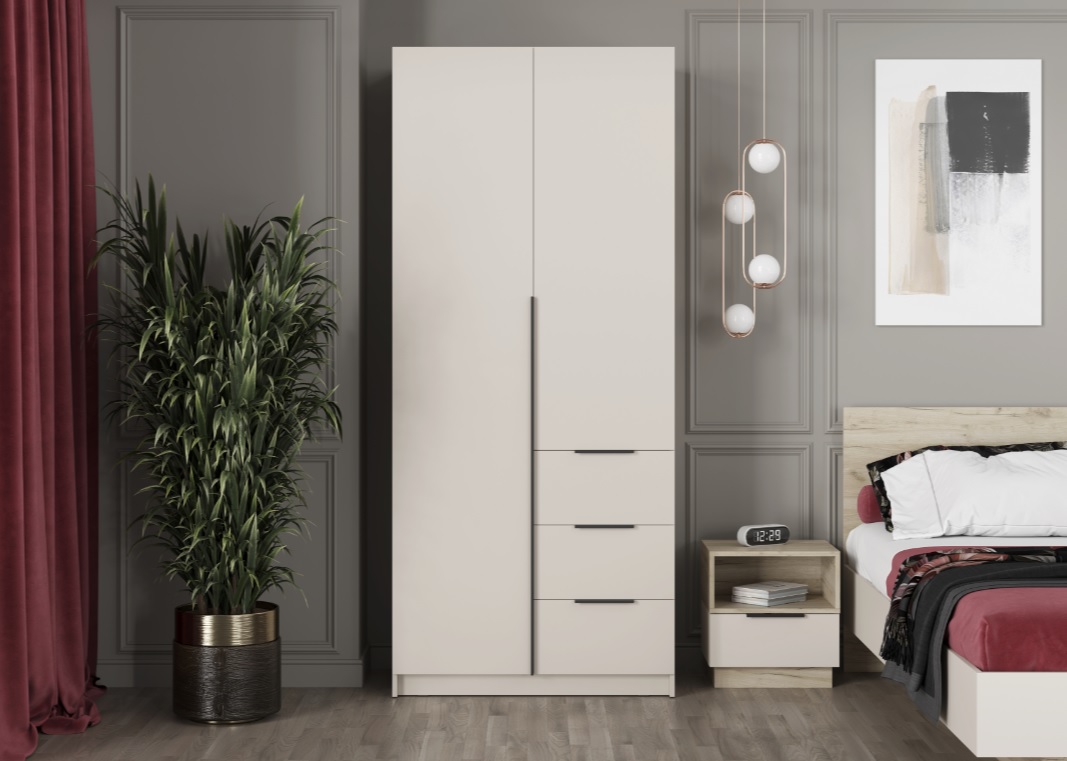 • Элегантный дизайн: Накладные фасады шкафа выполнены в стильном цвете "Кашемир". Левая створка и фасады ящиков оснащены черными пластиковыми ручками, а правая створка - без ручки, что добавляет минималистичный акцент.